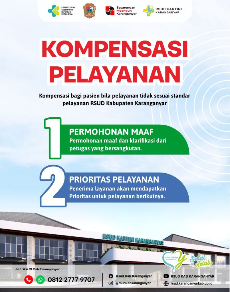 RSUD Kartini Karanganyar memberikan kompesasi bagi pasien yang berkunjung ke RSUD Kartini Karanganyar apabila mendapat pelayanan tidak sesuai dengan prosedure yang berlaku. Berikut SK pemberikan Kompensasi Pelayanan RSUD Kabupaten Karanganyar